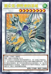 自己场上存在的这张卡被对方破坏送去墓地时,可以选择自己墓地存在的1只「星尘龙」表侧守备表示特殊召唤。此外,把墓地存在的这张卡从游戏中除外,选择自己场上表侧表示存在的1只龙族的同调怪兽才能发动。选择的怪兽1回合只有1次不会被战斗破坏,这个效果适用的伤害步骤结束时攻击力·守备力下降800。